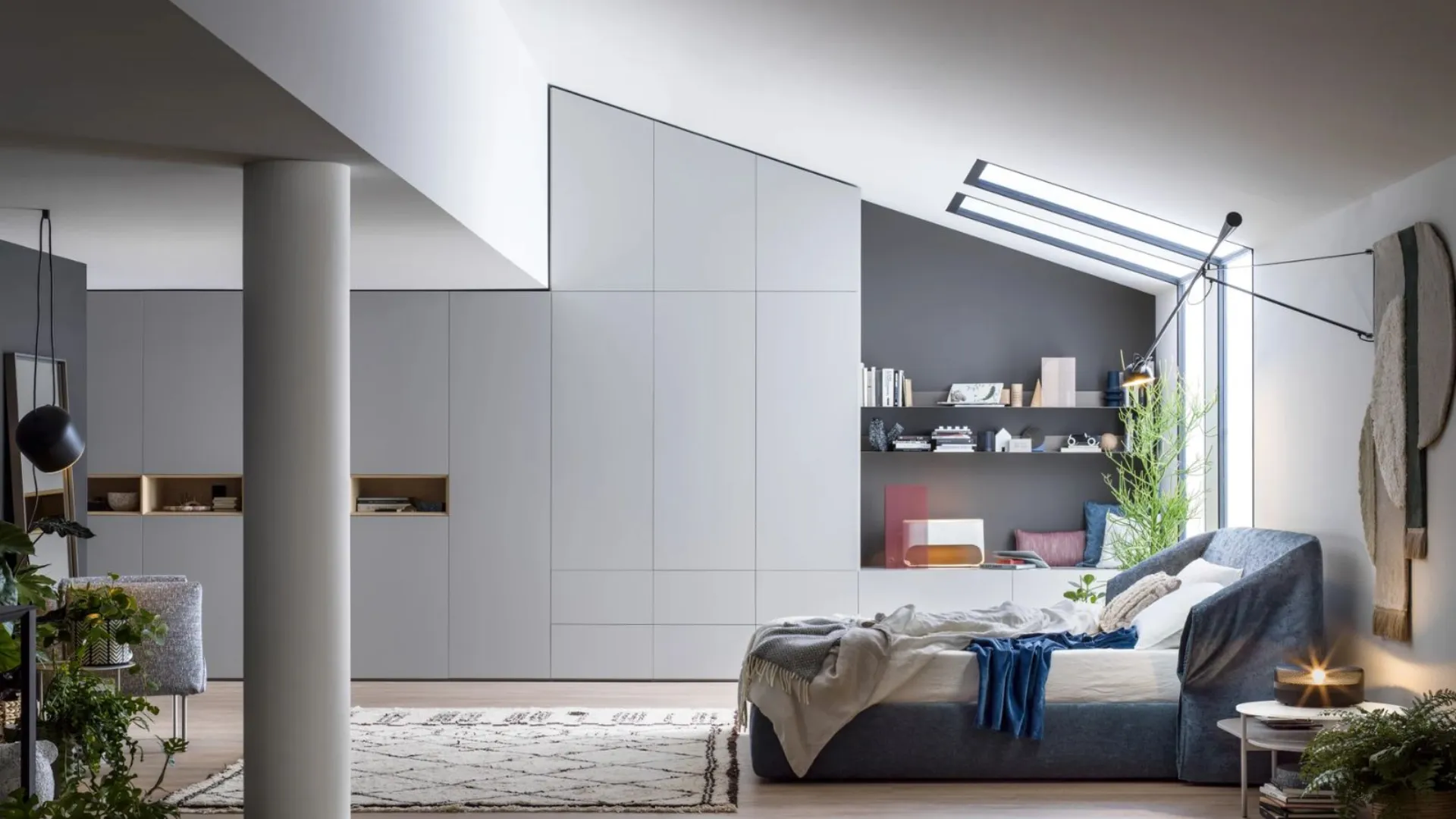 Febal Casa, con il sistema Pannello, realizza mobili contenitori per mansarda con ante battenti che si inseriscono con naturalezza dove il soffitto ha un'inclinazione variabile.