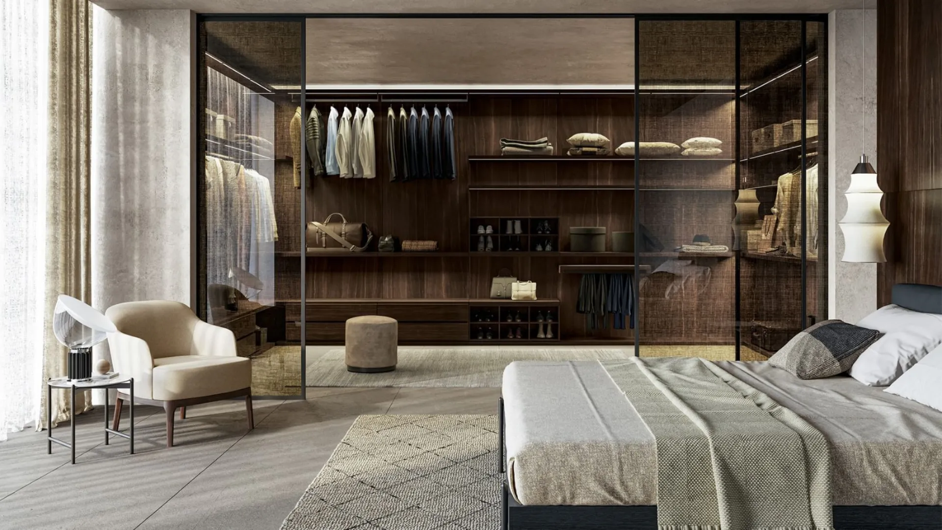 Se preferisci un'alternativa più discreta i sistemi di chiusura offrono una protezione anche ai capi più delicati. Le porte scorrevoli in vetro sono il connubio perfetto tra design e luminosità. Potrai scegliere il vetro con finitura satinata oppure a specchio se desideri nascondere alla vista il contenuto del guardaroba. Il progetto si conclude con la giusta illuminazione cabina armadio, fondamentale per valorizzare i volumi e facilitare la scelta quotidiana dei capi.